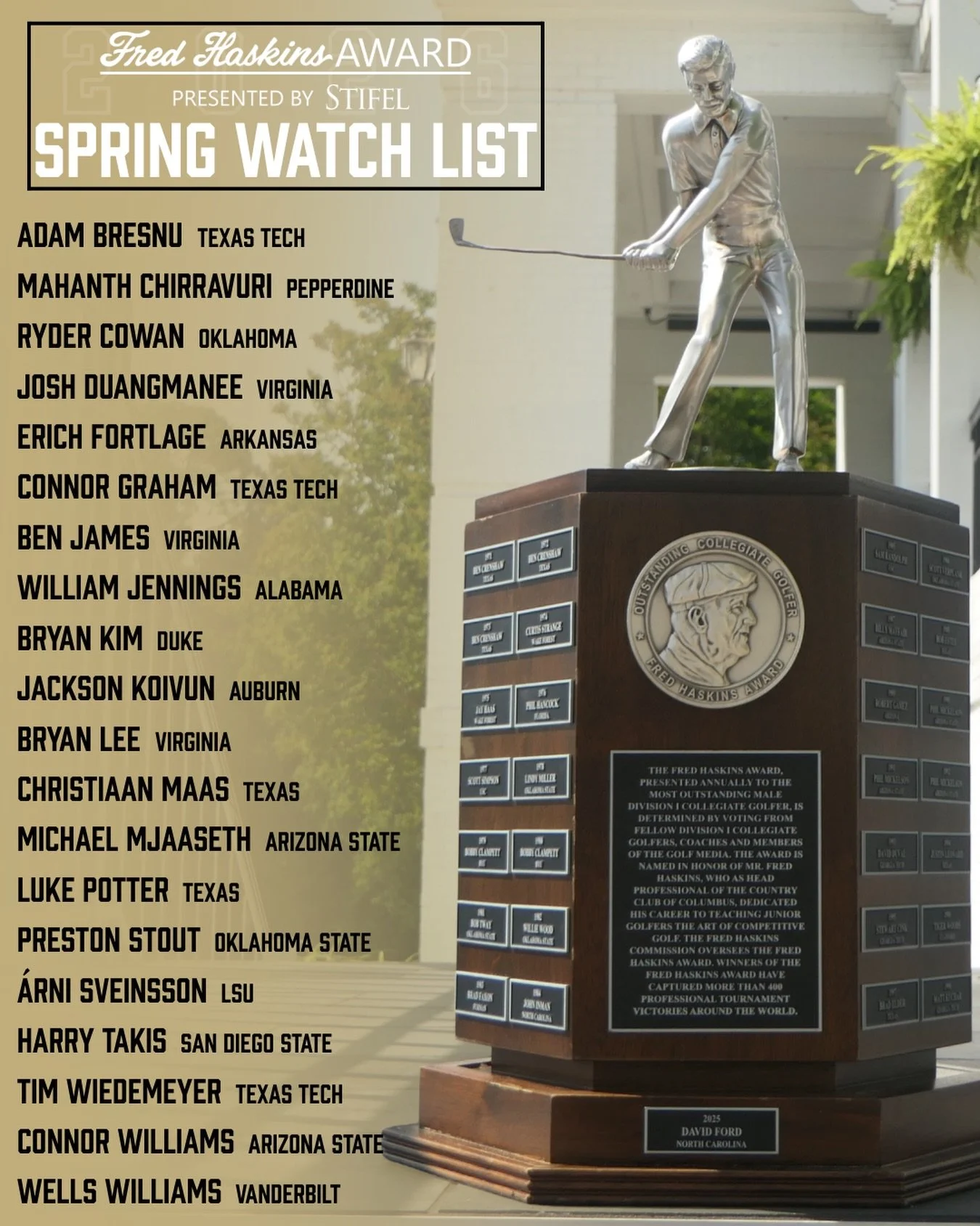 Since its formation in 1971, the Haskins Commission has been devoted to amateur golf and the presentation of the Haskins Award. This coveted trophy honors the year’s outstanding college golfer and the memory of Fred Haskins, a club pro that spent his life nurturing and mentoring amateur golfers. The commission, based in Columbus, Ga., oversees the voting conducted among college golfers, coaches and golf media.